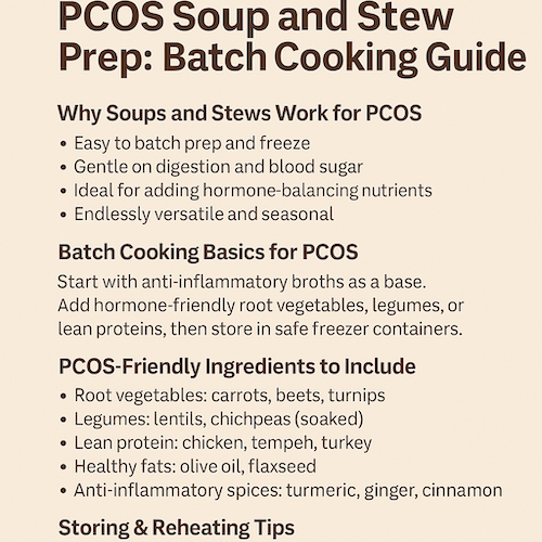 Soups and stews can be a comforting, nourishing staple for women managing Polycystic Ovary Syndrome (PCOS). With a little batch prep and smart ingredient selection, they become a powerful ally in supporting blood sugar balance, inflammation control, and hormone health.